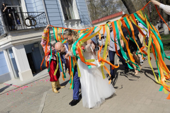 Для молодоженов была подготовлена праздничная программа с элементами русских национальных традиций, куличами и подарками.