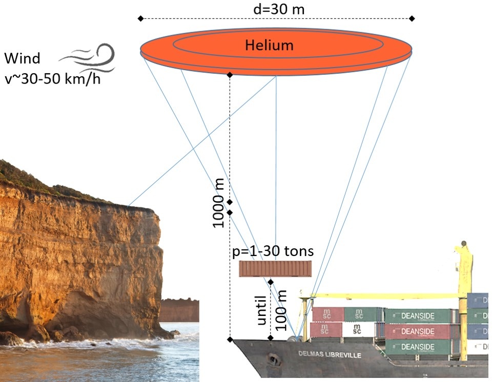 Согласно расчетной модели, разработка позволит поднимать и перемещать грузы массой до 30 тонн без использования подъемных кранов, платформ и причалов. Для этого нужно использовать подъемную силу, которую создает скорость ветра 30–50 км/ч. Груз на аэростате с гелием поднимают на высоту не менее километра от земли, затем по принципу маятника с помощью лебедок, крана и управляющих тросов его переносят на борт судна или на сушу.