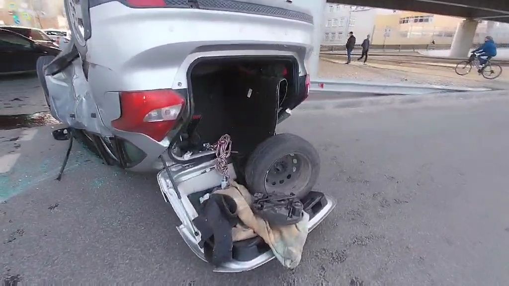 В результате столкновения корейская иномарка перевернулась на крышу, ее водитель получил травмы, но госпитализации не потребовалось.