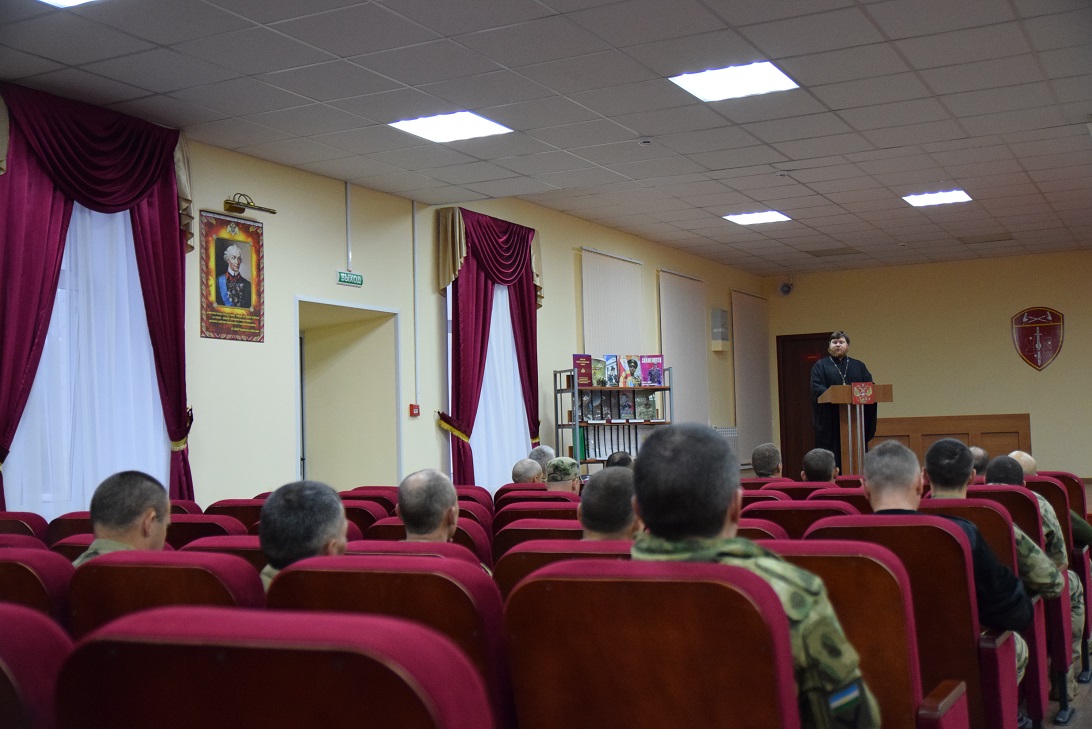 Помощник благочинного поздравил их с отмечавшимся 4 ноября Днем народного единства, рассказал о духовной чистоте русских полководцев и флотоводцев на примере святого адмирала Феодора Ушакова, а также об особенностях российского воинства — мужестве и милосердии. Священник отметил необходимость строго следовать воинской присяге, особенно в нынешних условиях.