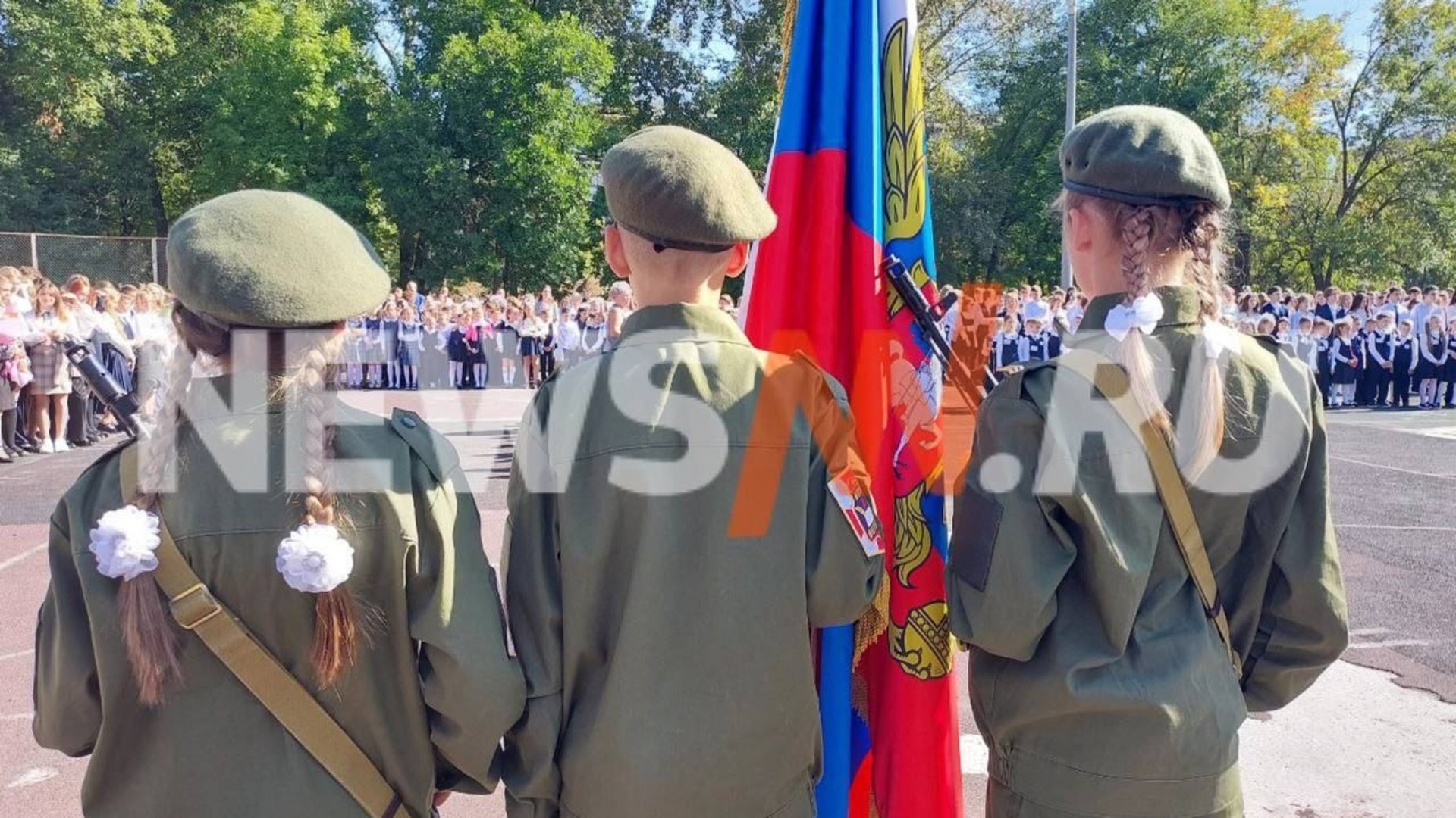 На опубликованных кадрах видно, что ученики стоят на линейке в камуфляжах и с оружием в руках, рядом выступает священник. По словам сотрудников учреждения, в военной форме на праздник пришли шестиклассники.