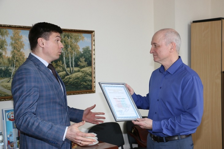 Председатель гордумы Антон Ульянов поблагодарил директора департамента городского хозяйства (ДГХ) Сергея Лобанова за добросовестный труд и поздравил с выходом на заслуженный отдых.