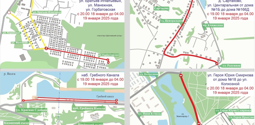 Кроме того, с 19.00 18 января до 04.00 19 января движение транспорта приостановят в деревне Сартаково по улице Центральной на участке от дома №1Б до дома №166Д. В указанный период планируется также ограничить движение по боковому проезду набережной Гребного канала (на участке от дома №10 улицы Красная Слобода до дома №111 набережной Гребного канала).
