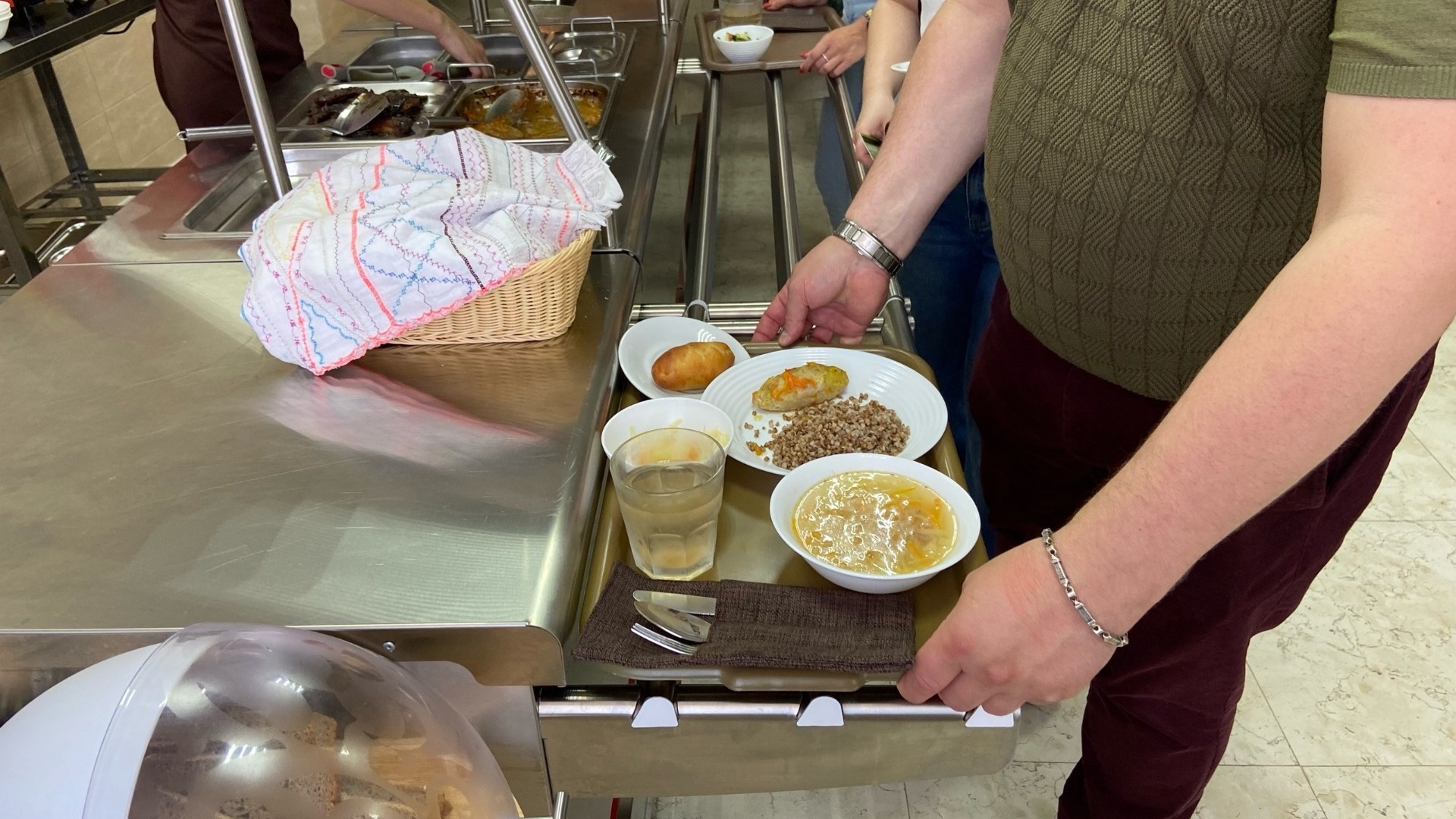 Обед обошелся в 210 рублей на человека. В него вошли салат из капусты, щи, гречка с котлетой, пирожок и компот.