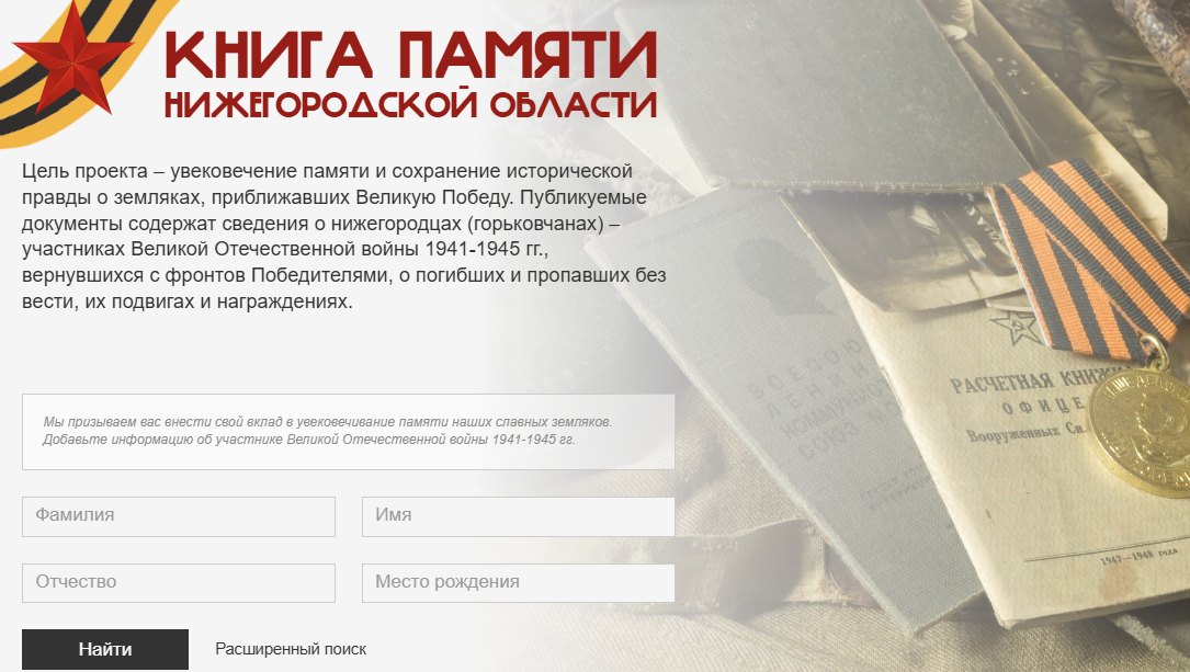 Напомним, на портале «Книга Памяти Нижегородской области» публикуются для широкого круга пользователей документы, содержащие сведения о нижегородцах (горьковчанах) — участниках Великой Отечественной войны 1941−1945 гг., вернувшихся с фронтов, о погибших и пропавших без вести, их подвигах и наградах, с целью увековечения памяти и сохранения исторической правды о земляках, приближавших Великую Победу.