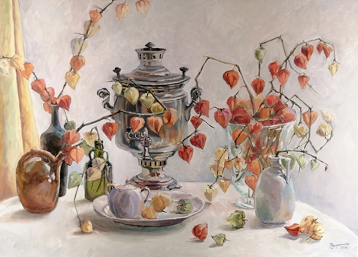 Разнообразны по мотивам и композиции натюрморты. В большинстве из них чувствуется женская рука. Художница подбирает предметы так, чтобы у зрителя возникали ассоциации с домашним теплом и уютом. Частым мотивом ее постановок являются букеты цветов. В картине «Зимний физалис» (2018 год, холст, масло) элегантные ветки с теплыми по цвету плодами показаны на фоне белых скатерти и стены, другие предметы также подобраны в холодной гамме: серебристый блеск металла, стекло, белая керамическая посуда.