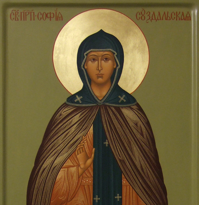 Преподобная София, в миру Соломония, великая княгиня, была дочерью боярина Юрия Константиновича Сабурова. В 1505 году на нее пал выбор наследника престола, будущего великого князя Василия Иоанновича. Брак их не был счастливым, так как Соломония оказалась бесплодной. Чтобы иметь наследника, великий князь Василий Иоаннович решил жениться вторично (на Елене Глинской) и 25 ноября 1525 г. велел постричь Соломонию в монахини. Насильно постриженная с именем София, Соломония была сослана под стражу в Суздальский Покровский монастырь, где подвигами изгнала из сердца мирские помыслы и всецело посвятила себя Богу.