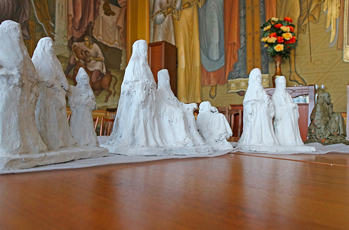 Это многофигурная композиция, в составе которой восемь известных сестер старого Дивеева: кроме игумении Марии, ее преемница будущая игумения Александра (Траковская), Серафимовские старицы монахини Капитолина и Ермиония, преподобноисповедница Матрона (Власова), блаженная Пелагия Ивановна, воспитанница дивеевского приюта Анечка Баринова, послушница Фрося Лахтионова – единственная сестра, дожившая до возобновления монашеской жизни в Дивееве.