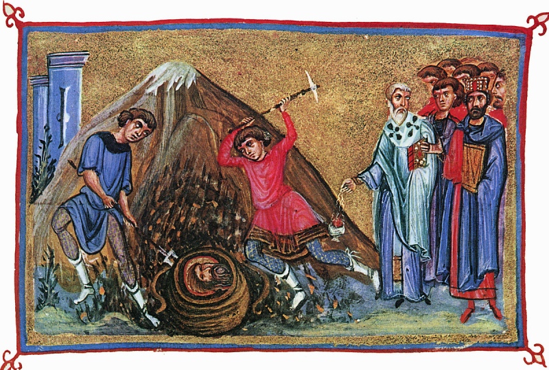 Когда вступил на престол великий царь Константин и просветил свою землю святым крещением, тогда мать его святая Елена стала возобновлять и очищать все иерусалимские святыни4. Она-то и святую гору привела в цветущее состояние. В это время два инока, подвизавшихся на Востоке, сговорились вместе идти в Иерусалим поклониться там честному Кресту, обретенному царицей Еленой, и гробу Господню и увидеть все святыни той земли. Достигнув Иерусалима, они стали обходить святыни, поклоняясь им и молясь Господу. Здесь одному из них, в сонном видении, явился святой Иоанн Предтеча, открыл то место, где была погребена его честная глава, и повелел взять ее из недр земных. Пробудившись, инок рассказал о видении своему товарищу, но тот, считая все это за простой сон, и сам не поверил и другому внушил то же. На следующую ночь святой Иоанн явился вторично, но уже каждому иноку, и притом отдельно, и сказал: "Воспряньте, оставьте ваше неверие и леность и сотворите то, что было вам возвещено".