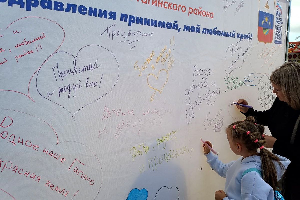 Все желающие оставляли свои пожелания на большой поздравительной открытке-банере, специально установленной местным отделением «Единой России».