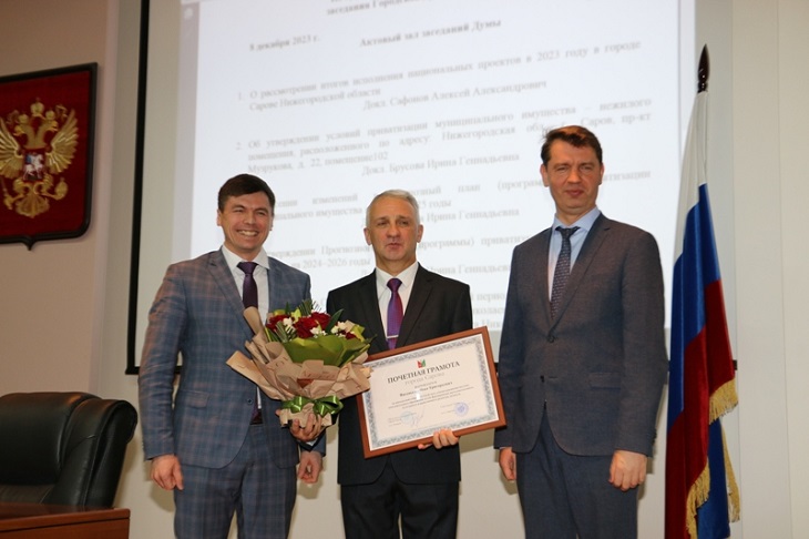 Перед началом заседания гордумы председатель думы Антон Ульянов и глава города Алексей Сафонов торжественно наградили Почетной грамотой города Сарова руководителя объединения “Шашки” Дворца детского творчества Олега Васенькина.
