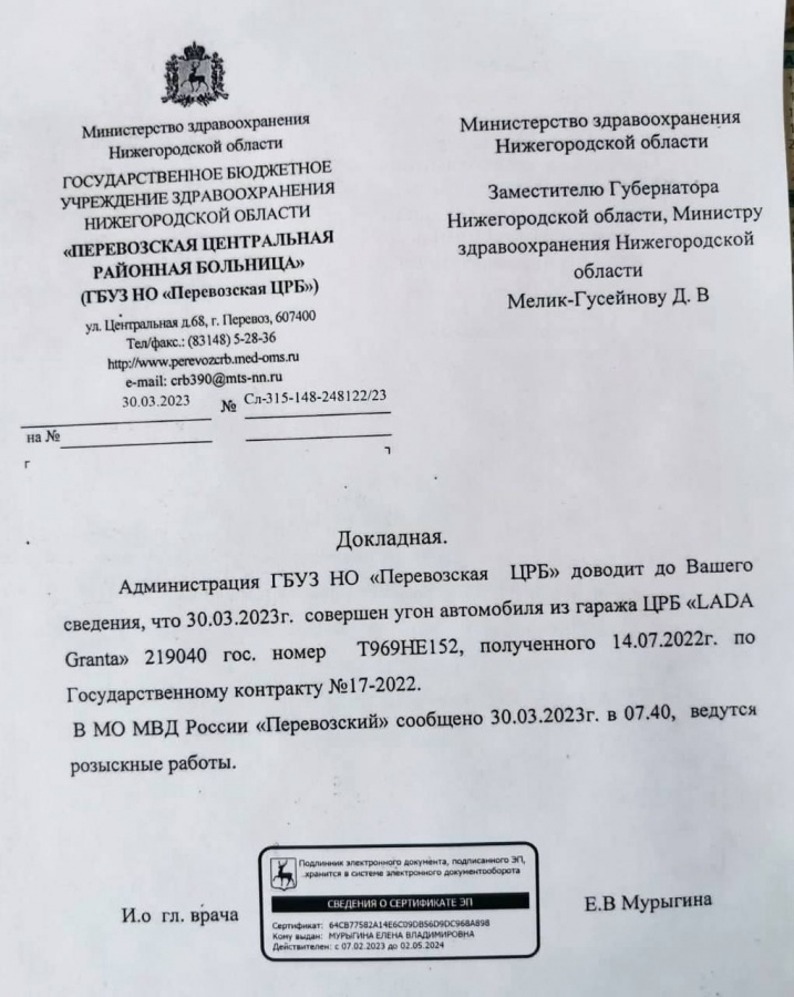 Полученный в середине июля прошлого года Перевозской ЦРБ автомобиль Lada Granta был угнан 30 марта этого года из гаража медучреждения. Об этом преступлении у себя в Telegram-канале написал министр здравоохранения Нижегородской области Давид Мелик-Гусейнов.